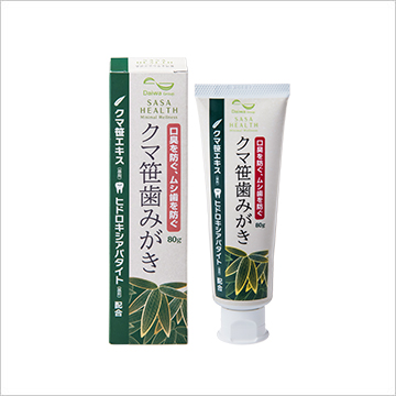 口臭を防ぐ、ムシ歯を防ぐ、歯を白くする、口中を浄化する、歯垢を除去する、歯のヤニをとる、歯石の沈着を防ぐ。天然由来100%のクマ笹エキスを使用。口臭や虫歯を予防し、白く健康な歯を。